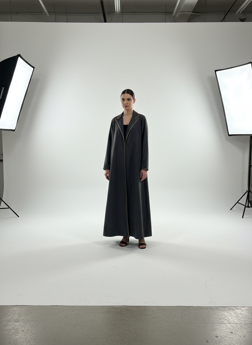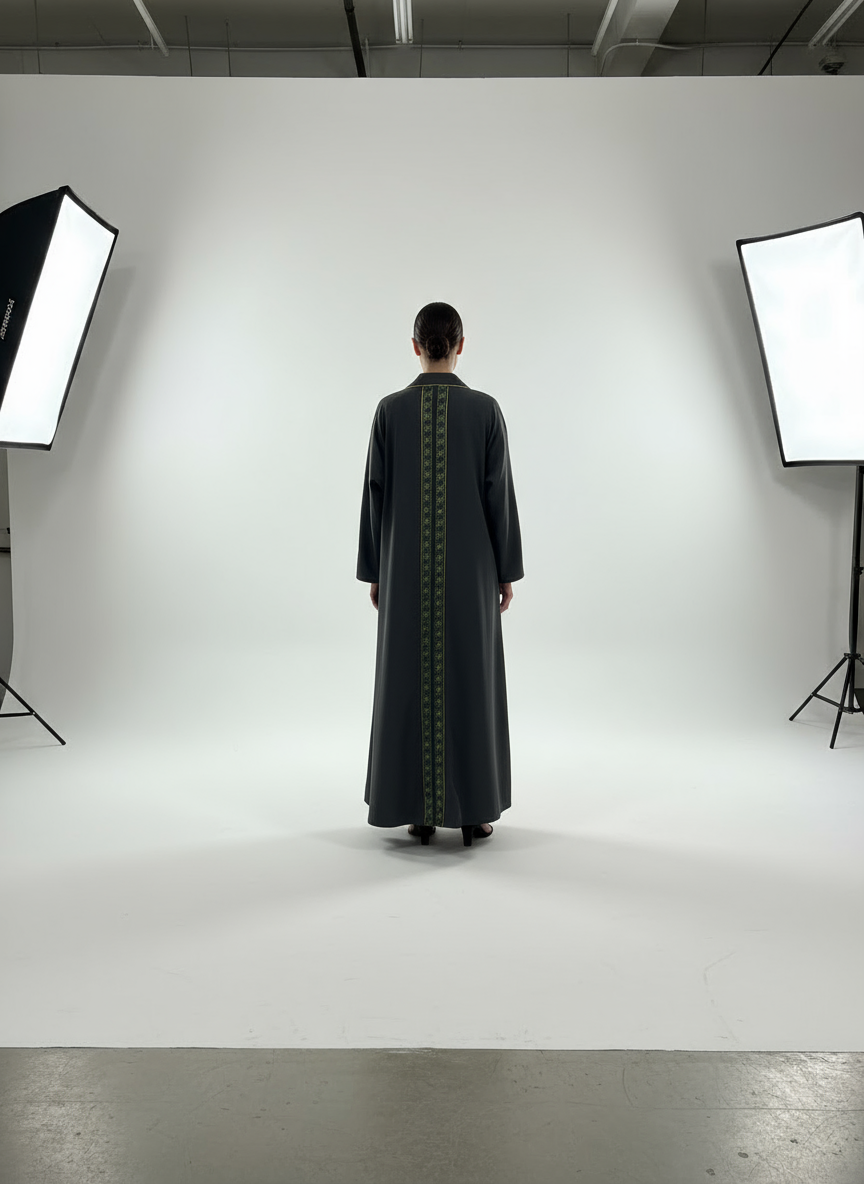 عباية فاخرة من قماش شامواه ناعم بلون رمادي أنيق، تميّزت بخطوط تطريز عمودية في الظهر تجمع بين الأخضر والذهبي بتفاصيل دقيقة تعكس الذوق الرفيع.
