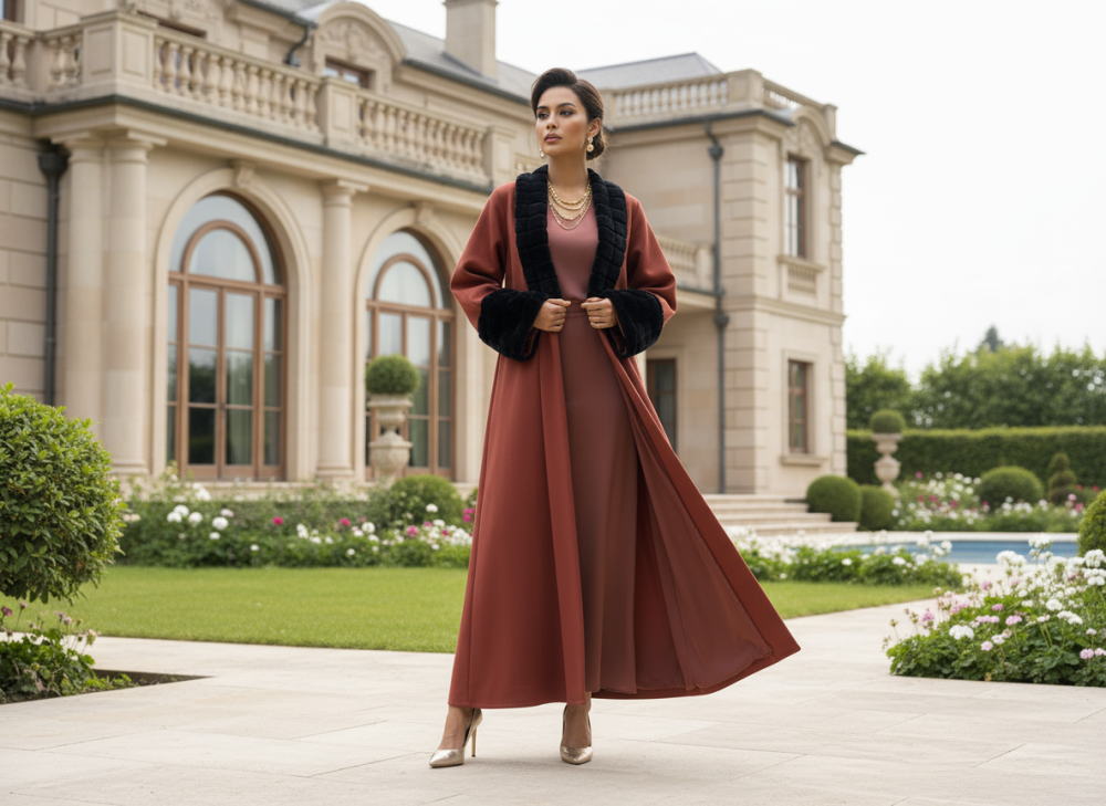 عباية شتوية فاخرة باللون الطوبي الدافئ مزينة بتفاصيل الفرو لإطلالة دافئة وعصرية تجمع بين البساطة والفخامة مثالية للمناسبات الشتوية