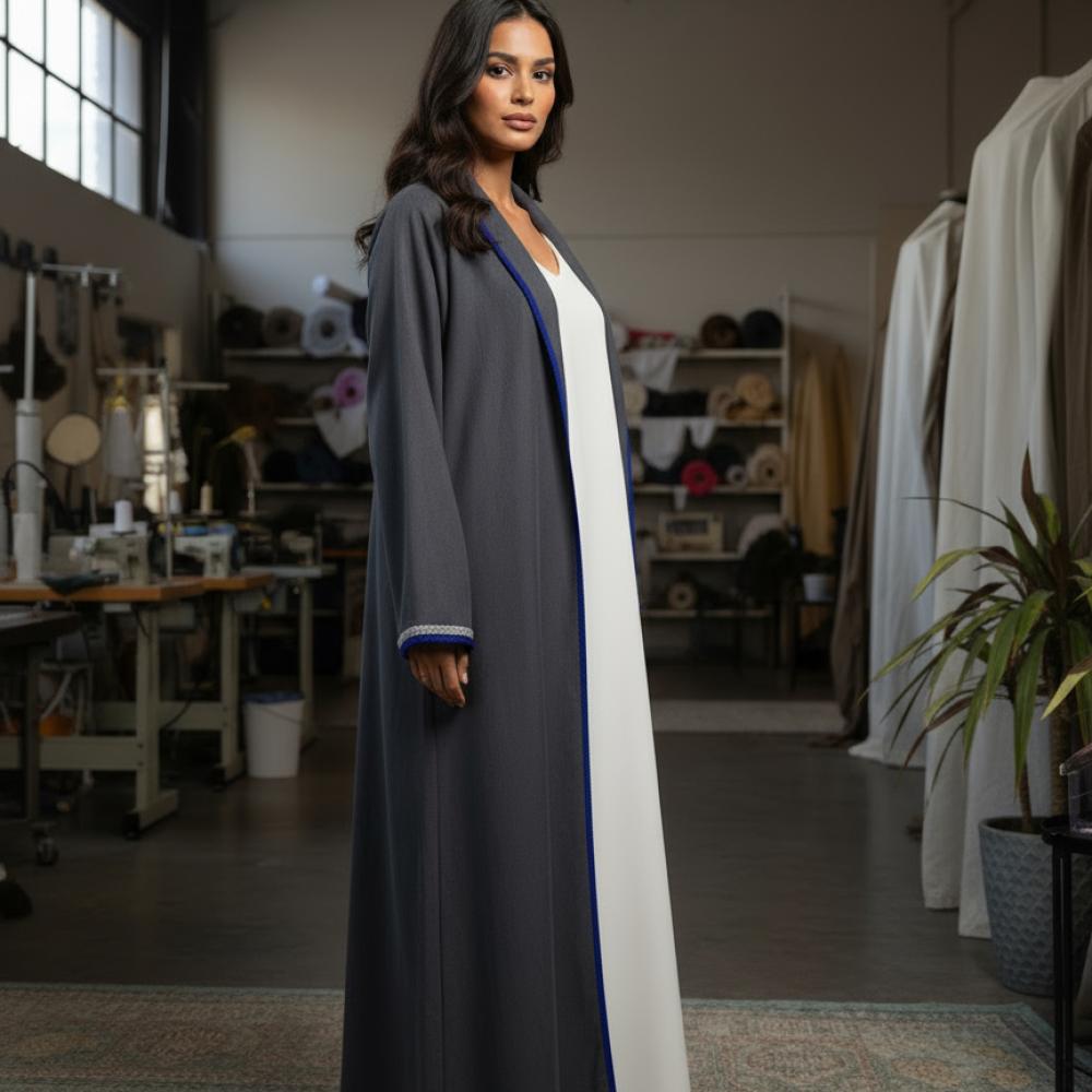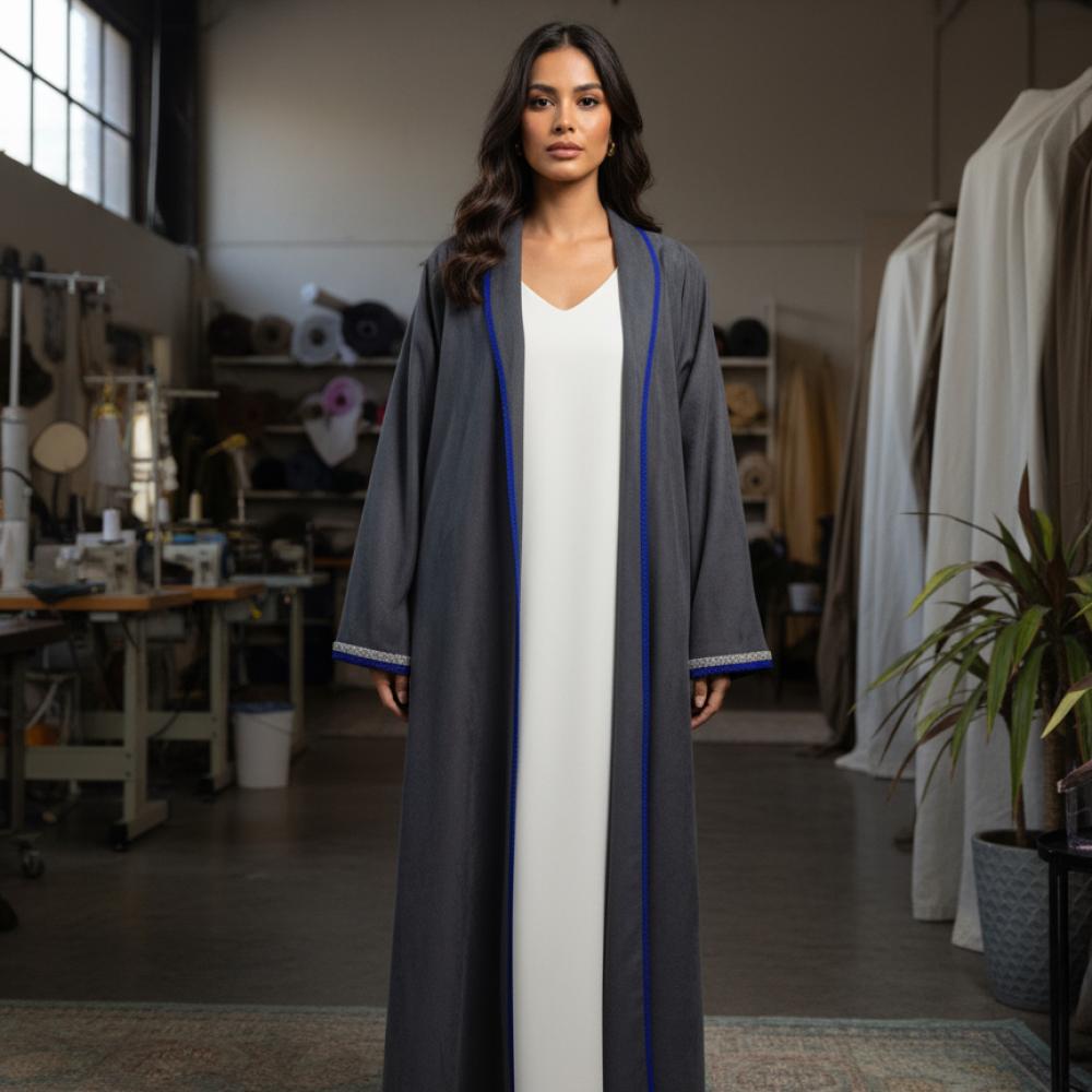 عباية شامواه رمادية أنيقة تتميز بتفاصيل فريدة تجمع بين الفخامة والنعومة، مزينة بأطراف بلون نيلي يضيف لمسة عصرية راقية، مع تطريز أبيض دقيق يمنحها طابع أنثوي ناعم ولمسة من الترف. مناسبة للإطلالات الشتوية الراقية والذوق العصري الهادئ