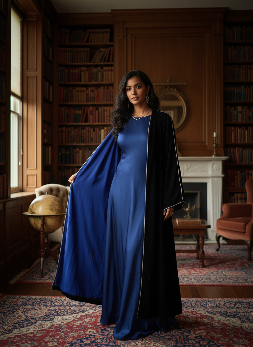عباية مخملية فاخرة باللون الأسود مع بطانة داخلية باللون الأزرق الملكي مزينة بخطوط لامعة على الأطراف لإطلالة أنيقة تجمع بين الرقي والفخامة