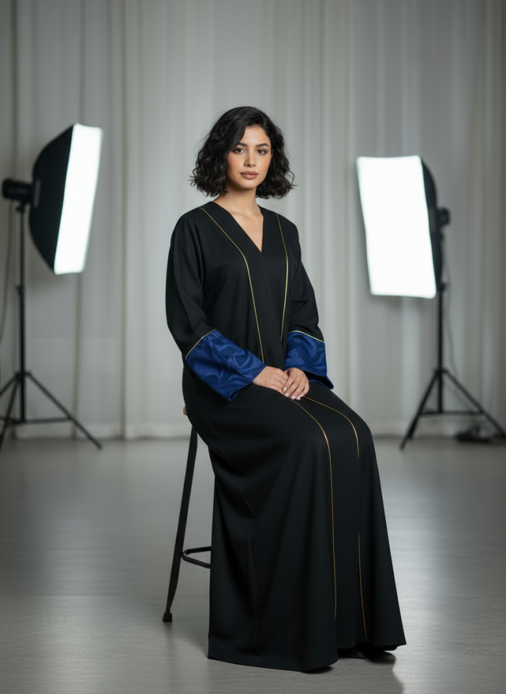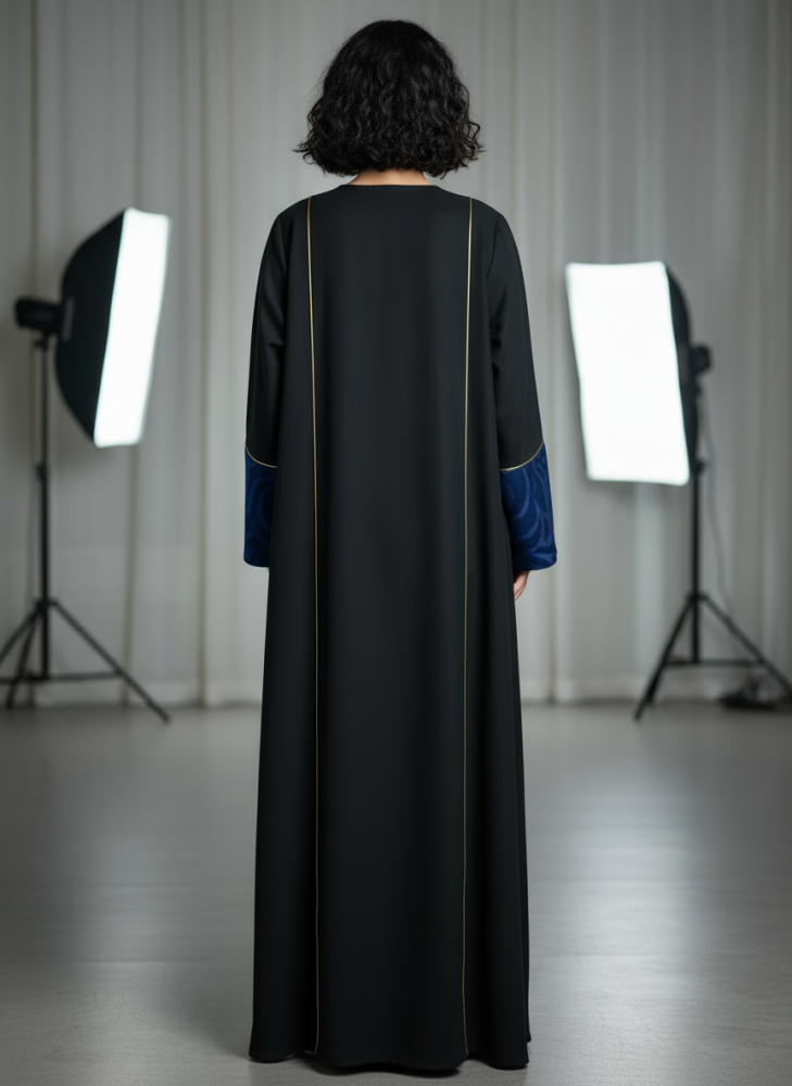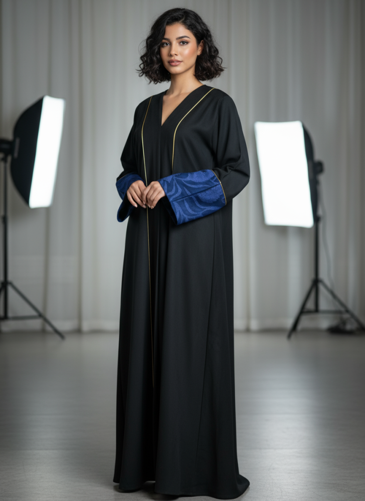 عباية أنيقة مصممة من قماش الشامواه الناعم الذي يمنح إطلالة راقية ومميزة مزينة بلمسات من المخمل الأزرق الفخم لإبراز التفاصيل وإضافة عمق لوني ساحر.. مثالية للمناسبات المسائية والاجتماعات الخاصة تجمع بين الرقي والفخامة