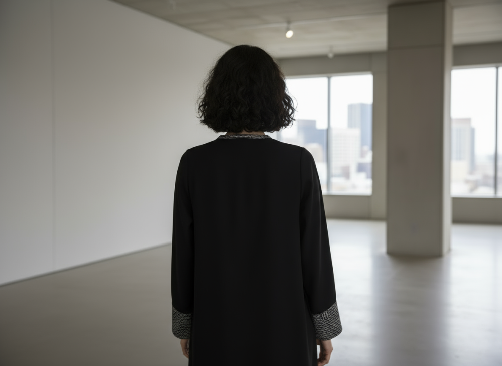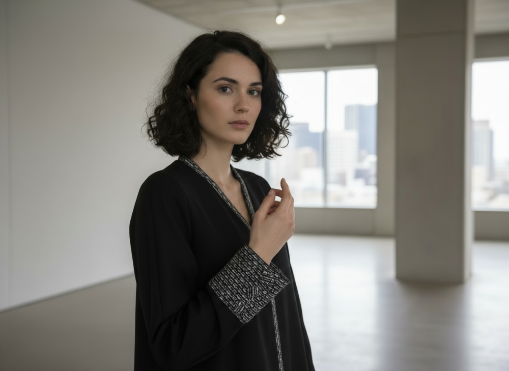 عباية سوداء كلاسيكية مزينة بخطوط تطريز أبيض على الأكمام والحواف الأمامية. تصميمها البسيط والأنيق يجعلها خيارًا مثاليًا للاستخدام اليومي والمناسبات في آن واحد