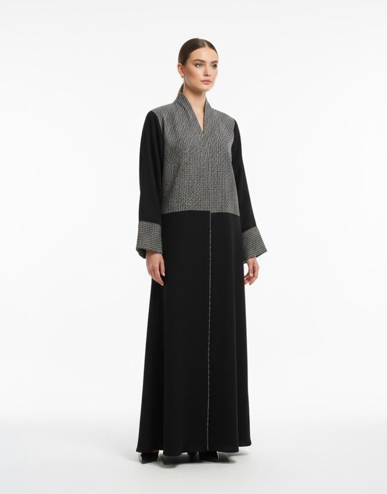 عباية أنيقة بتصميم انسيابي باللون الأسود مع نقش رمادي علوي وأطراف الأكمام، تضفي لمسة راقية وعصرية تناسب مختلف المناسبات